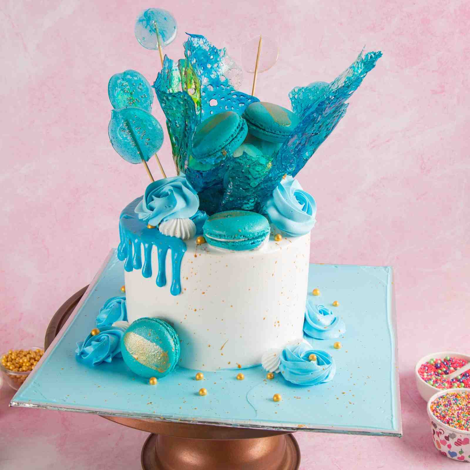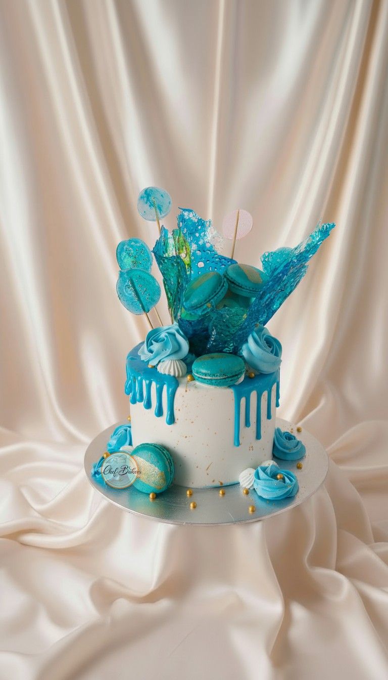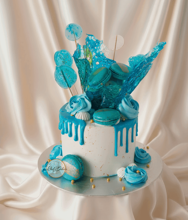 Stylish blue cake topped with macarons and candy décor — perfect for birthdays and celebrations.