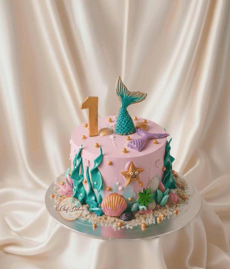 Whimsical ocean cake with mermaid tail, seashells, and starfish — perfect for birthdays and sea-themed parties.