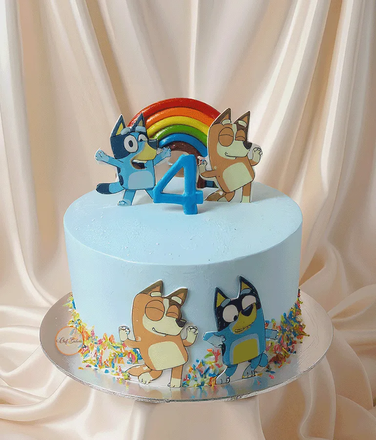 Cute Bluey themed cake with rainbow topper and character cutouts—perfect for kids’ birthdays. Custom age, name, flavor, size and colors available.