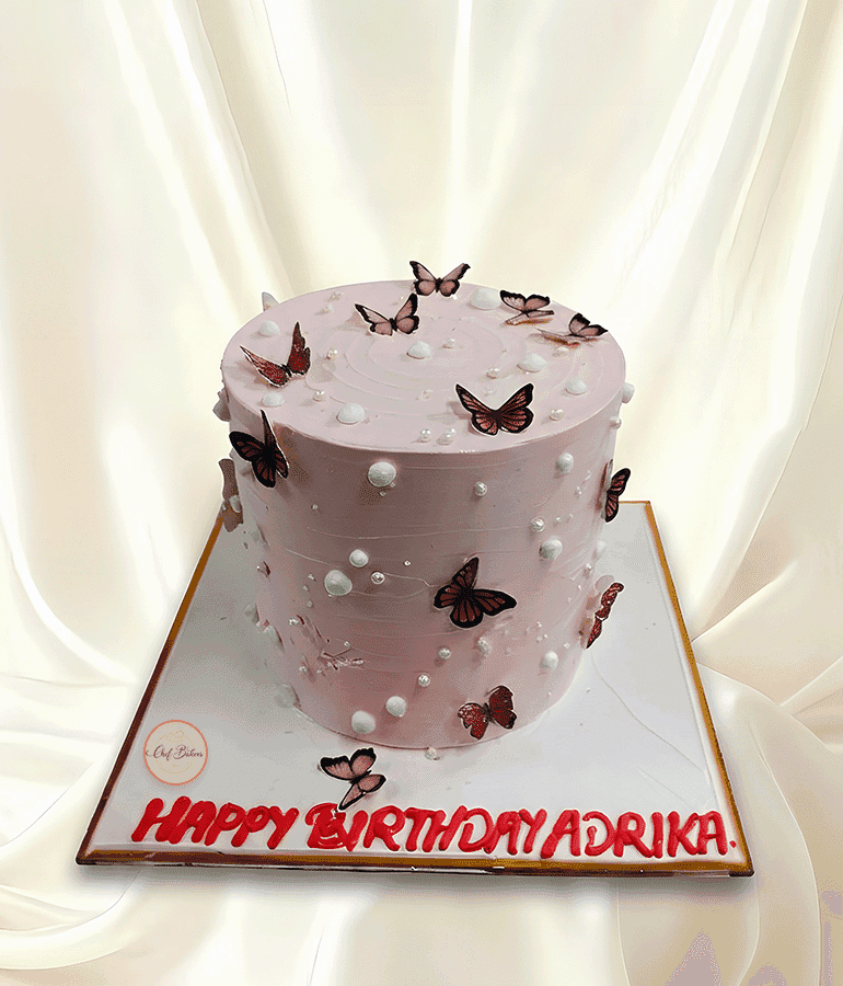 Soft pink butterfly cake with pearl accents and elegant finish—perfect for birthdays and celebrations. Custom name, flavor, size and color options available.