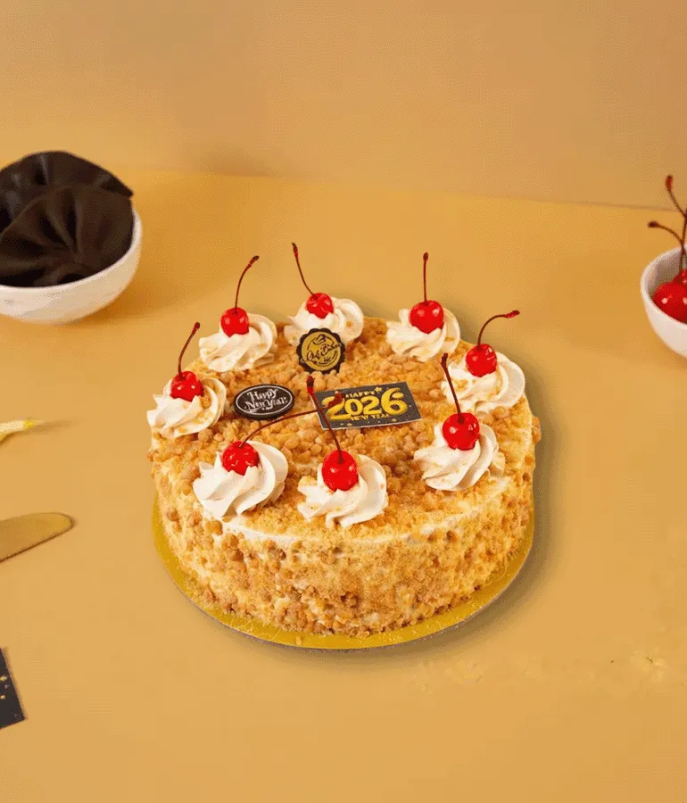 Butterscotch Cake – A soft sponge layered with caramelized butterscotch crunch and whipped cream, offering a sweet and nutty delight.