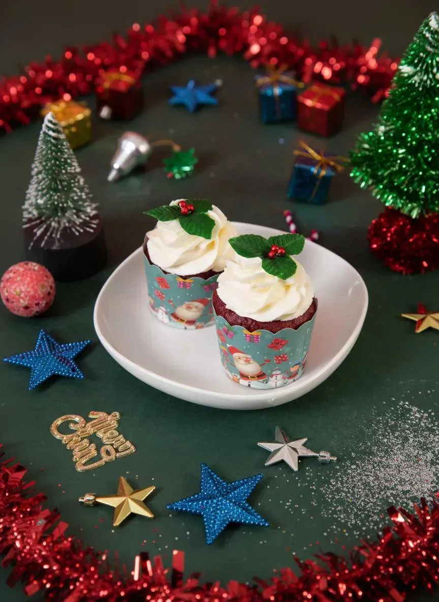 A festive red velvet cupcake topped with whipped cream and decorated with holly leaves—perfect for spreading holiday cheer.