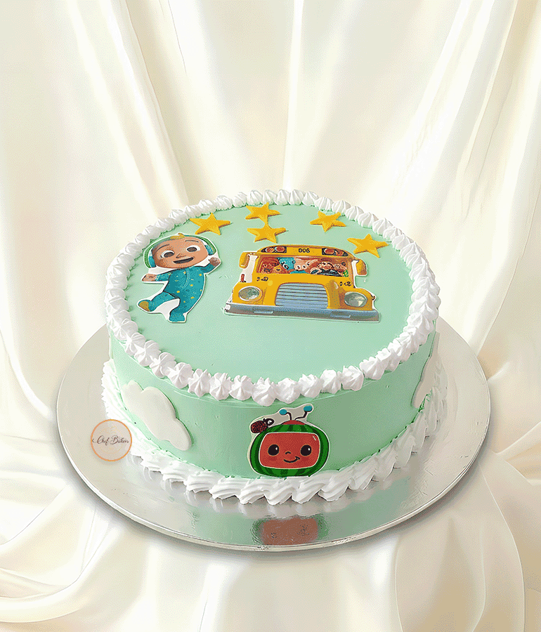 Cocomelon bus themed cake with cute topper design and cream border—perfect for kids’ birthdays. Custom name, age, flavor, size and colors available.
