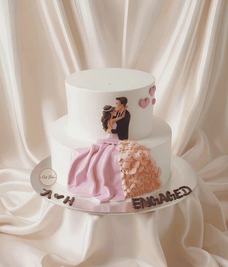 Elegant engagement cake with romantic couple topper, soft pastel dress detail and hearts—perfect for proposals & engagements. Custom flavors, size and text.