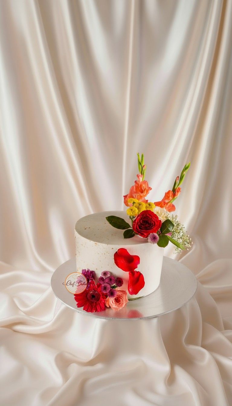 Stylish flower cake adorned with roses and colorful blossoms — perfect for weddings, anniversaries, and special occasions.