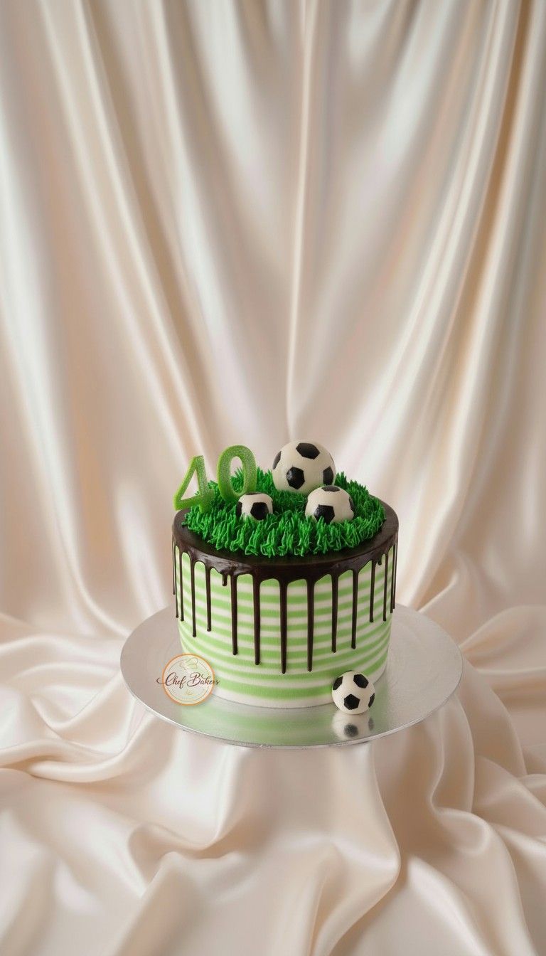 Fun football cake with grass, soccer balls, and chocolate drip — perfect for birthdays and sports lovers.