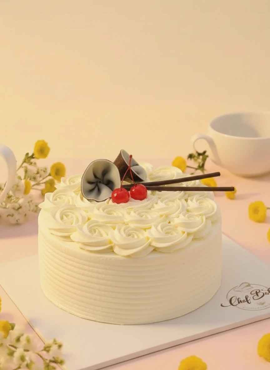 French Vanilla Bourbon Cake with soft vanilla sponge and bourbon-infused cream, offering a smooth, rich, and flavorful dessert experience.