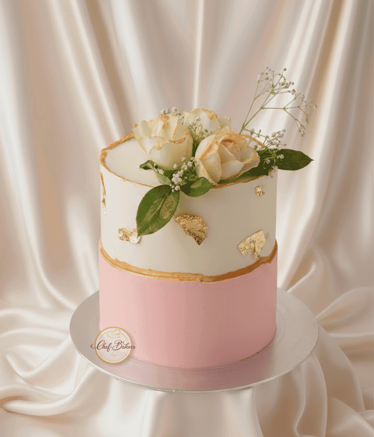 Graceful floral cake with roses and gold accents — perfect for weddings, engagements, or elegant celebrations.