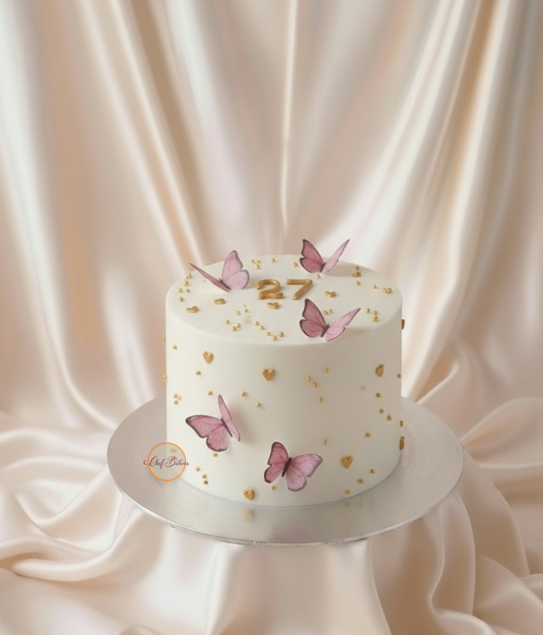 Elegant white buttercream cake decorated with pink butterflies and gold accents. Perfect for a 27th birthday or any stylish celebration. Customizable and beautifully crafted.