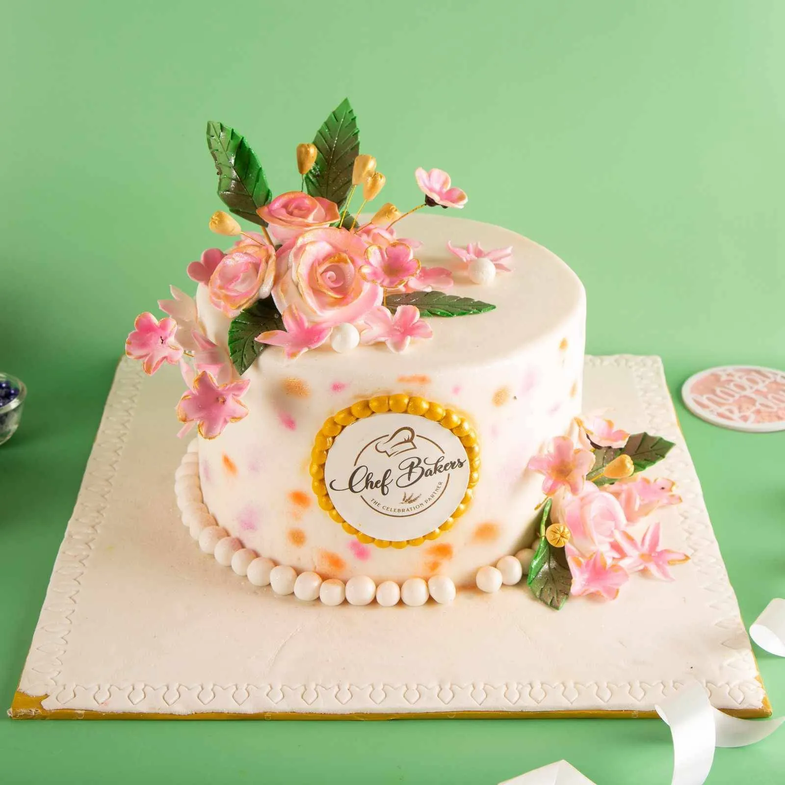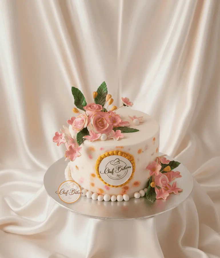 Luxurious golden rose cake adorned with pink roses and gold highlights — perfect for weddings, anniversaries, or grand celebrations.