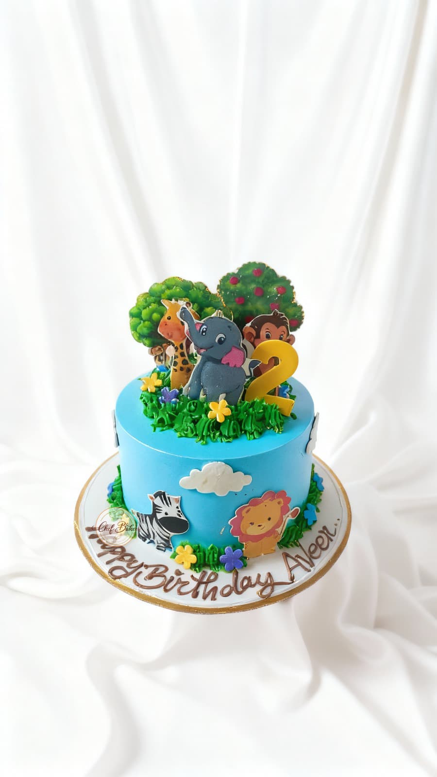 A fun, vibrant jungle-themed birthday cake featuring playful animals and lush greenery—perfect for adventurous celebrations.