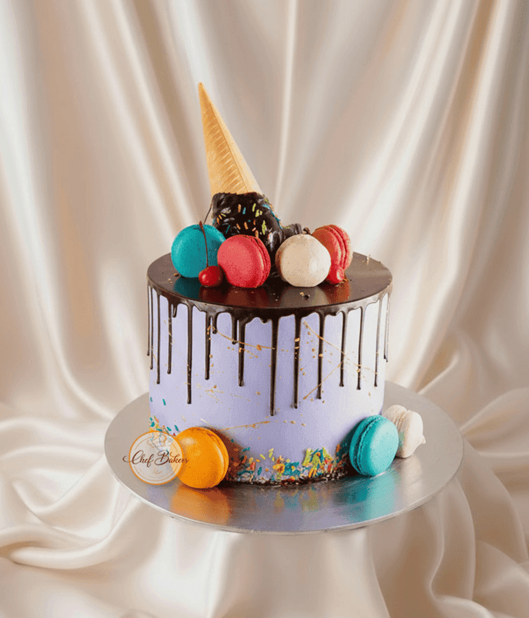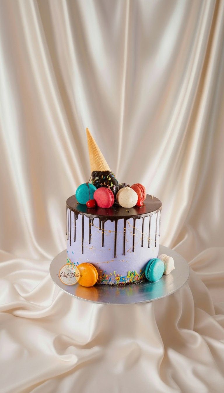 Fun melting Cornetto cake topped with cone, macarons, and chocolate drip — perfect for birthdays and parties.