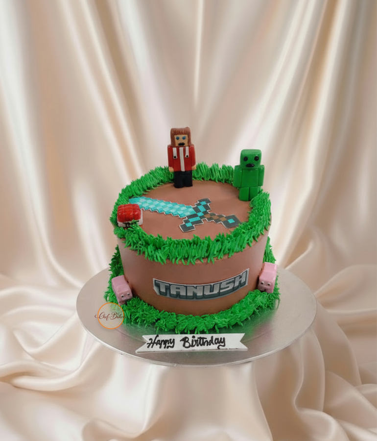 Minecraft-inspired cake with edible grass frosting, character toppers, and pixel sword detail—perfect for gaming parties and themed celebrations.