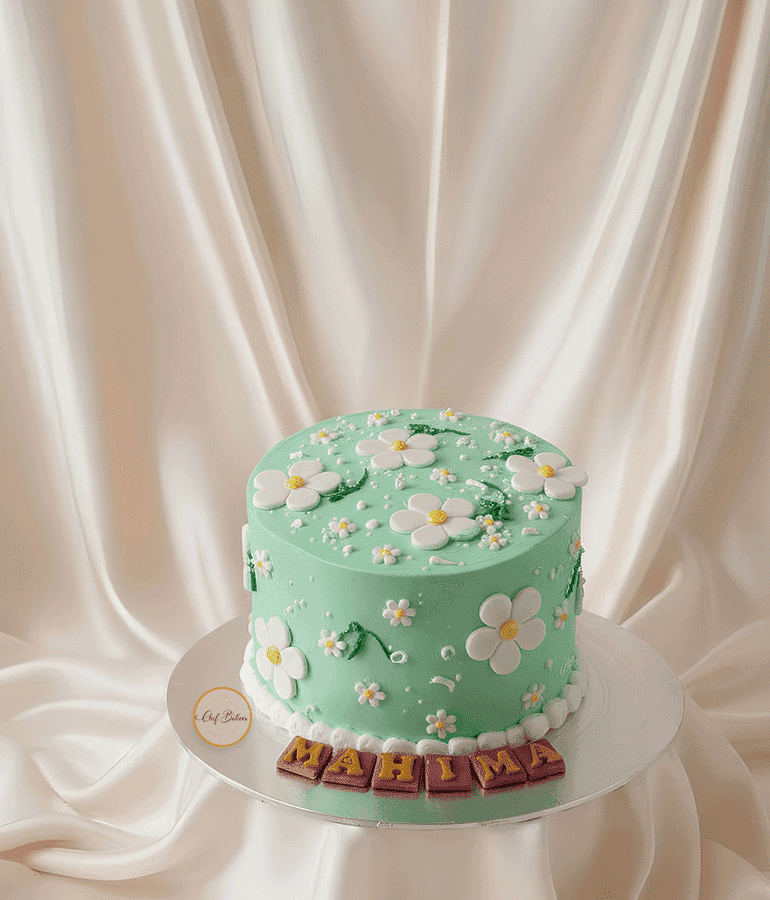 Fresh mint green cake with cute daisy flowers and sprinkle details—perfect for birthdays and spring celebrations. Custom name, flavor, size and colors available.