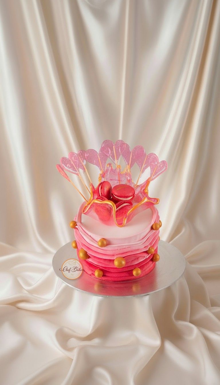 Chic peach rose designer cake with macarons and sugar décor — perfect for birthdays, weddings, and grand celebrations.