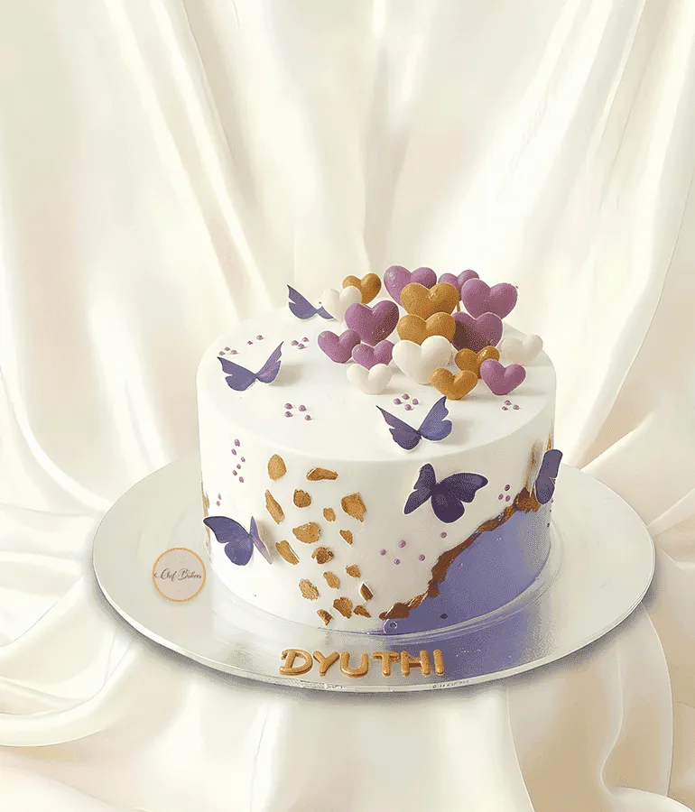 White and purple cake with butterfly accents and heart toppers, finished with gold texture details—perfect for birthdays. Custom name, flavor, size & colors.