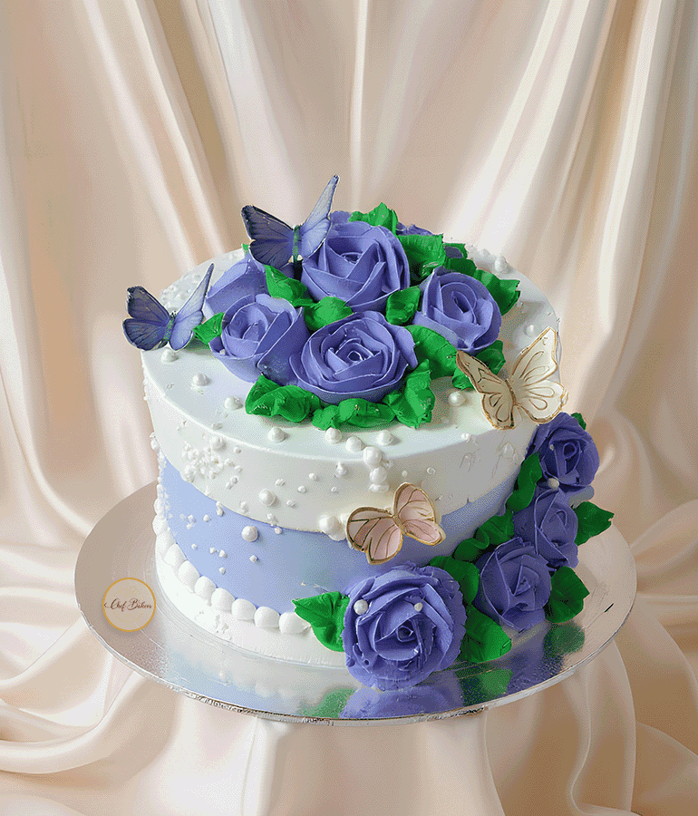 Elegant purple rose cake with butterfly accents and pearl sprinkle details—perfect for birthdays and anniversaries. Custom flavor, size, colors and message available.
