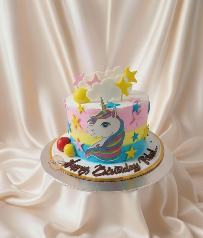 Colorful rainbow unicorn cake with fondant stars and clouds—perfect for kids’ birthdays. Custom flavors, sizes, and message available.