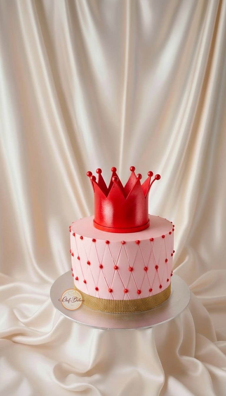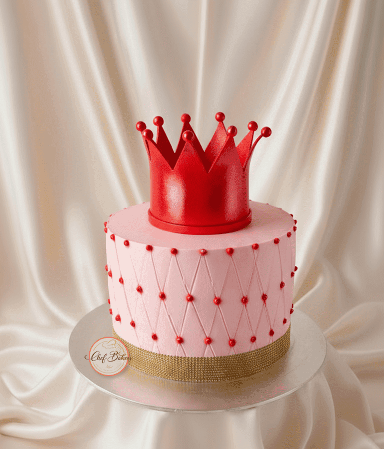 Royal red crown cake with quilted detail and crown topper — perfect for birthdays, anniversaries, and grand celebrations.