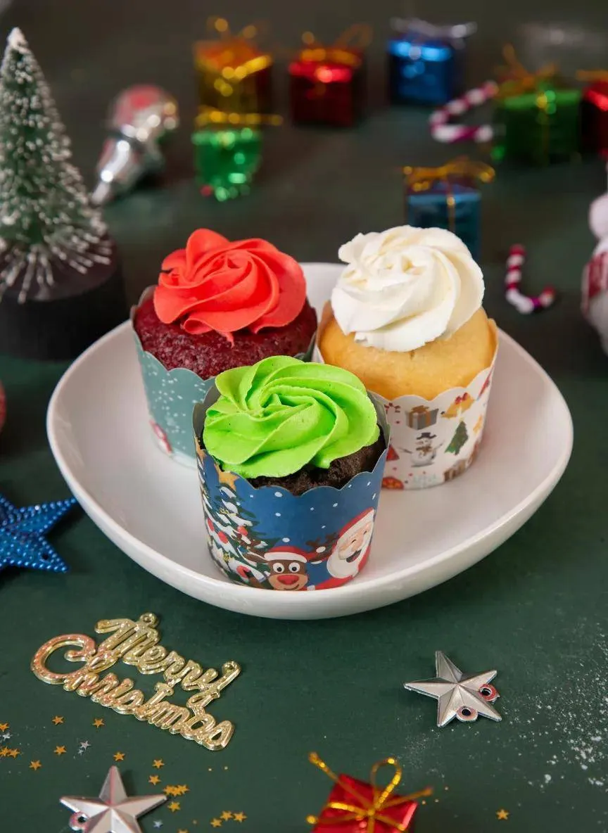 A festive trio of cupcakes featuring red velvet, chocolate, and classic vanilla, each topped with vibrant holiday-colored frosting.