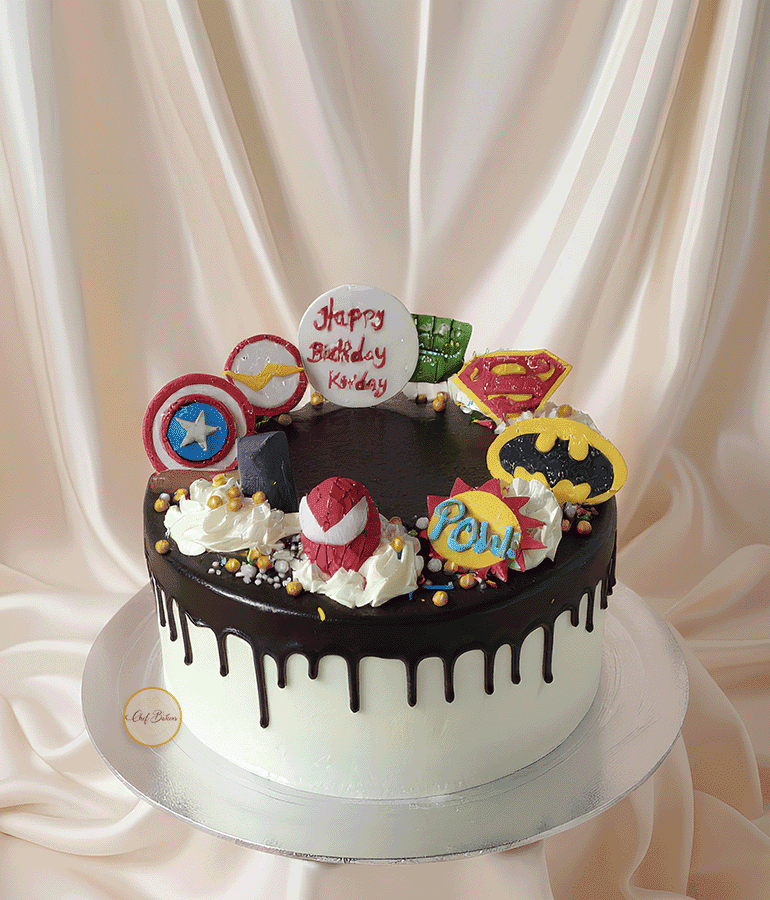 Chocolate drip cake topped with superhero icons—perfect for boys’ birthdays. Custom name, age, flavor, size and theme toppers available.