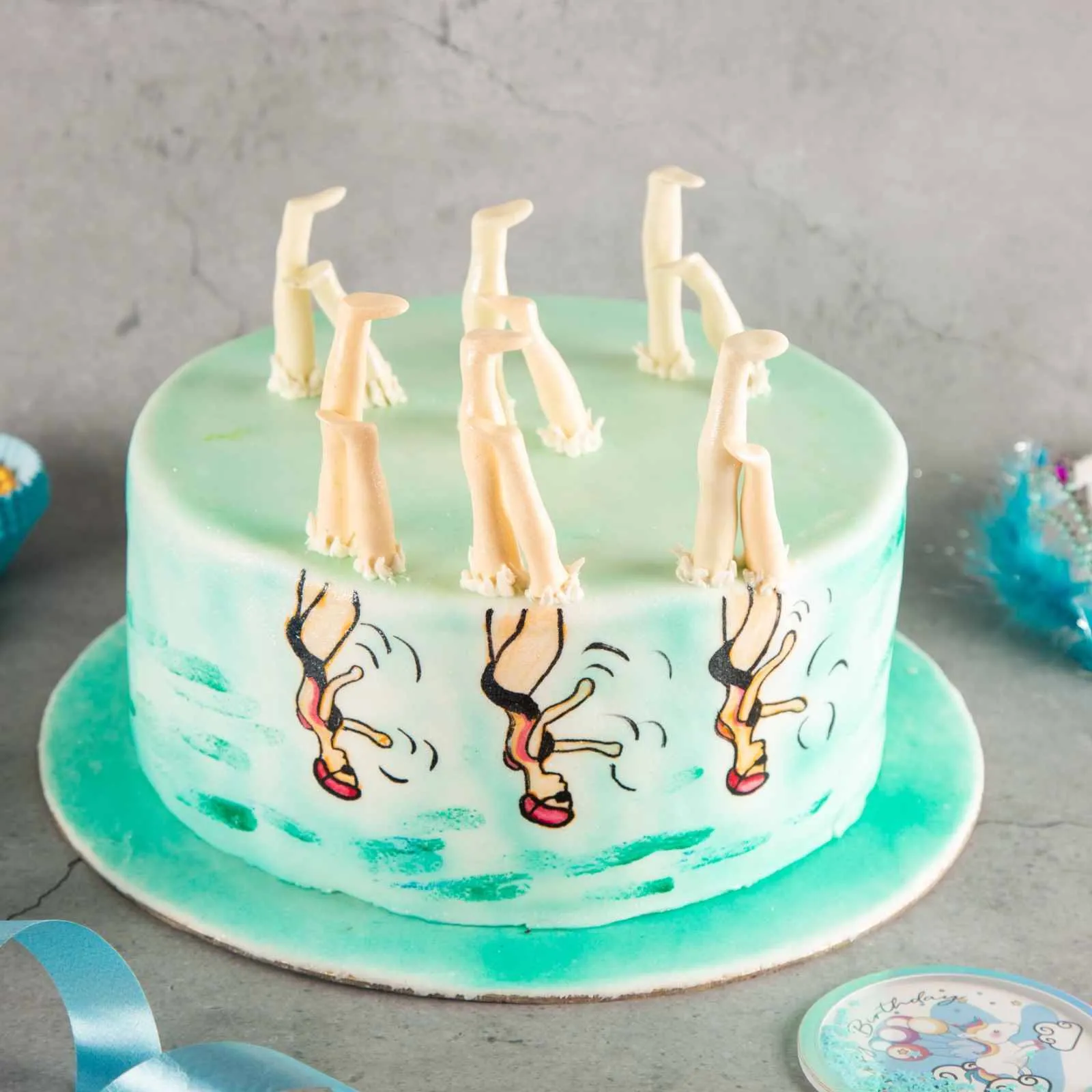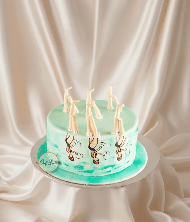 Unique synchronized swimming cake with swimmer figures and water décor — perfect for sports lovers and themed parties.