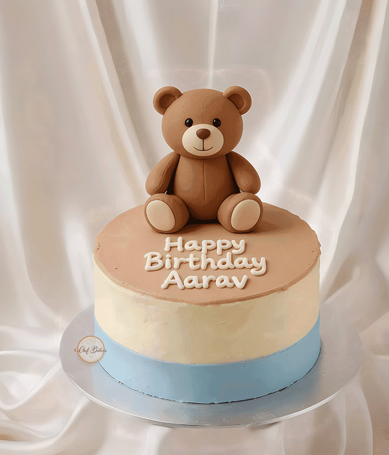 Adorable teddy bear theme birthday cake with smooth fondant finish and custom name text. Perfect kids cake design for first birthday and baby celebrations.