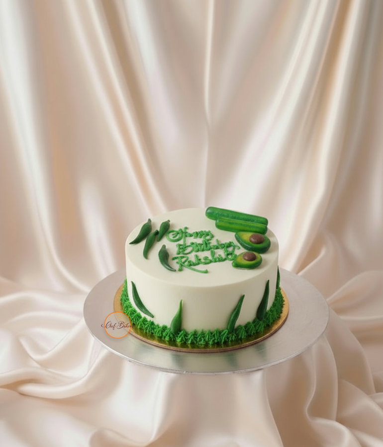 A unique birthday cake decorated with cucumber designs and green grass, perfect for vegetable lovers and a fun, fresh celebration.