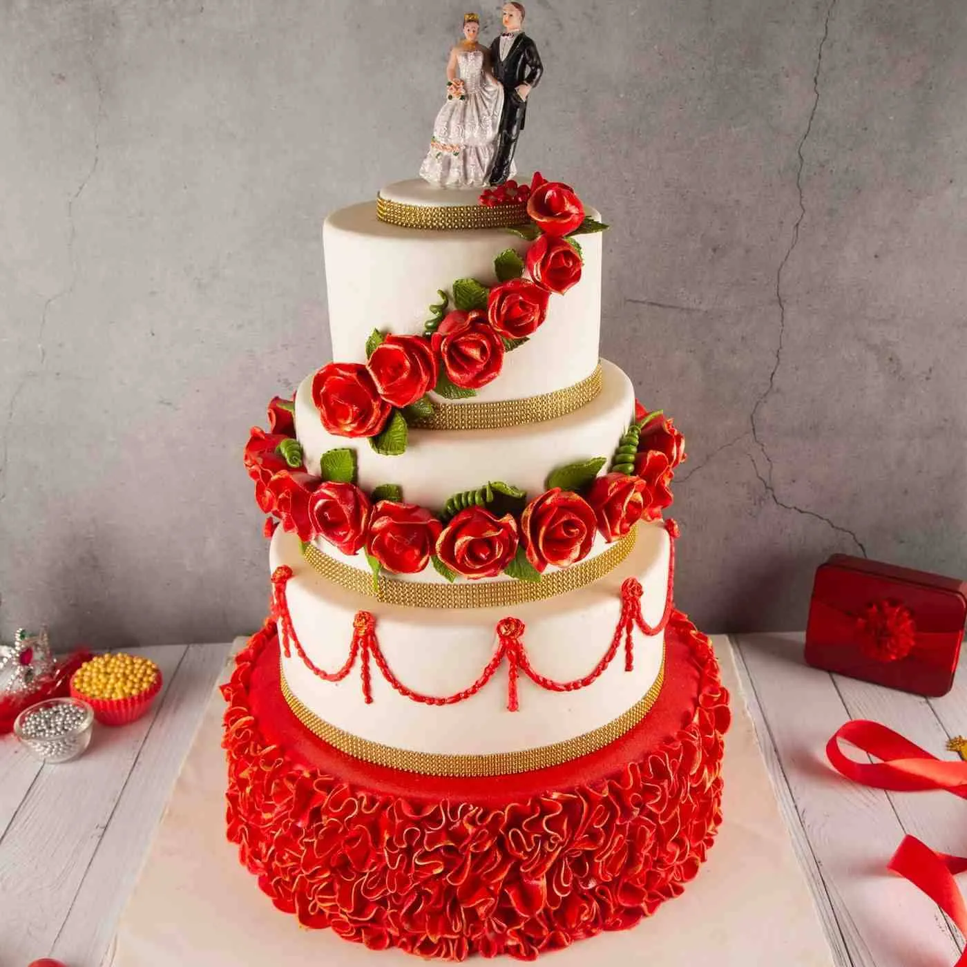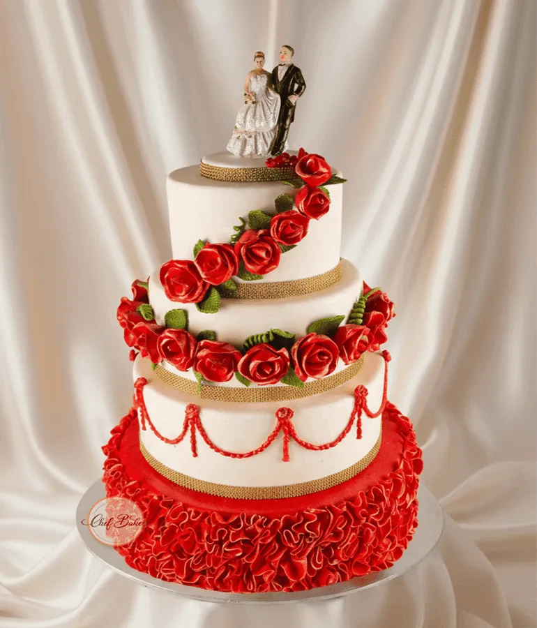 Elegant wedding cake adorned with red roses and gold details — perfect for weddings and grand celebrations.