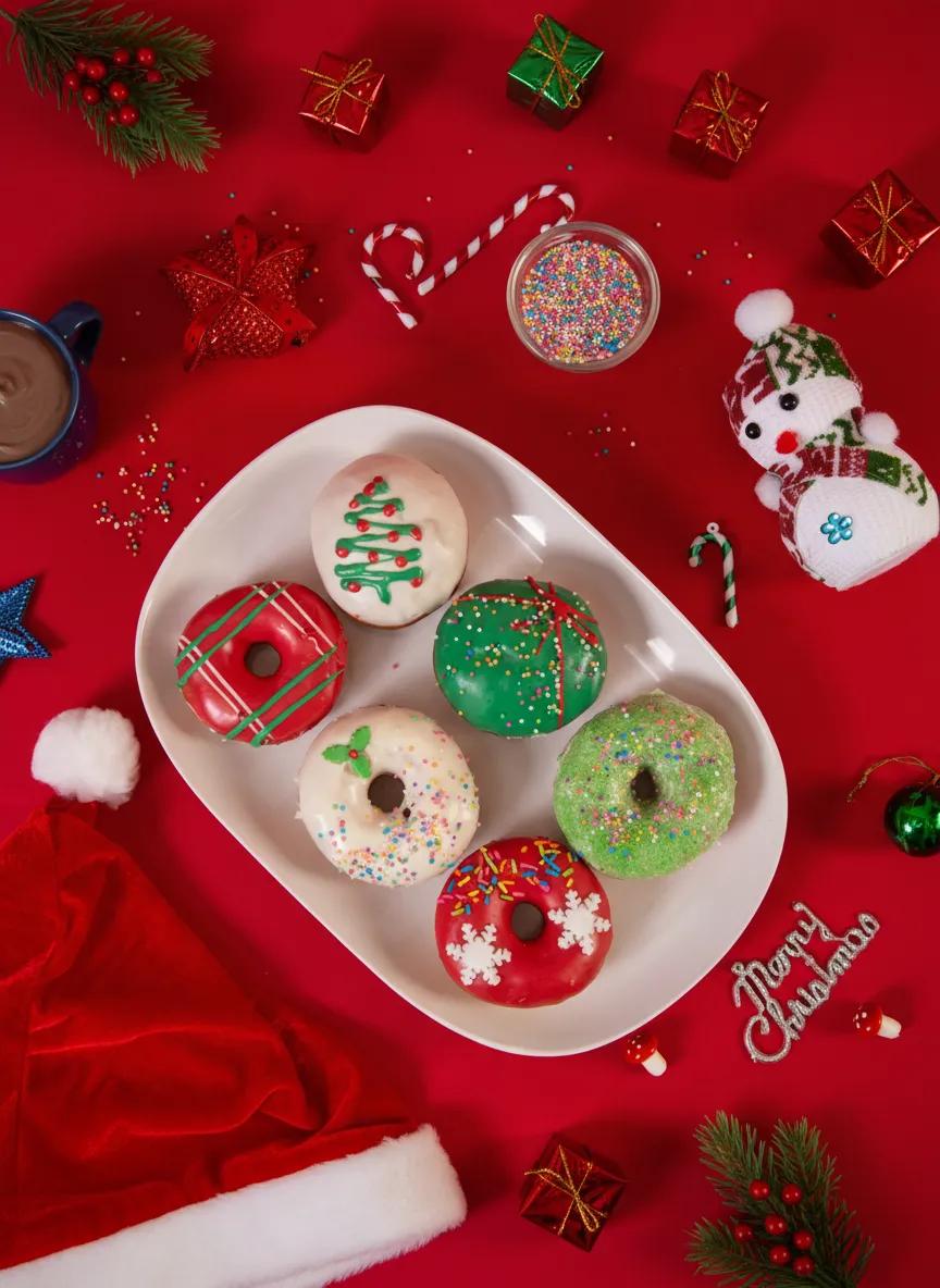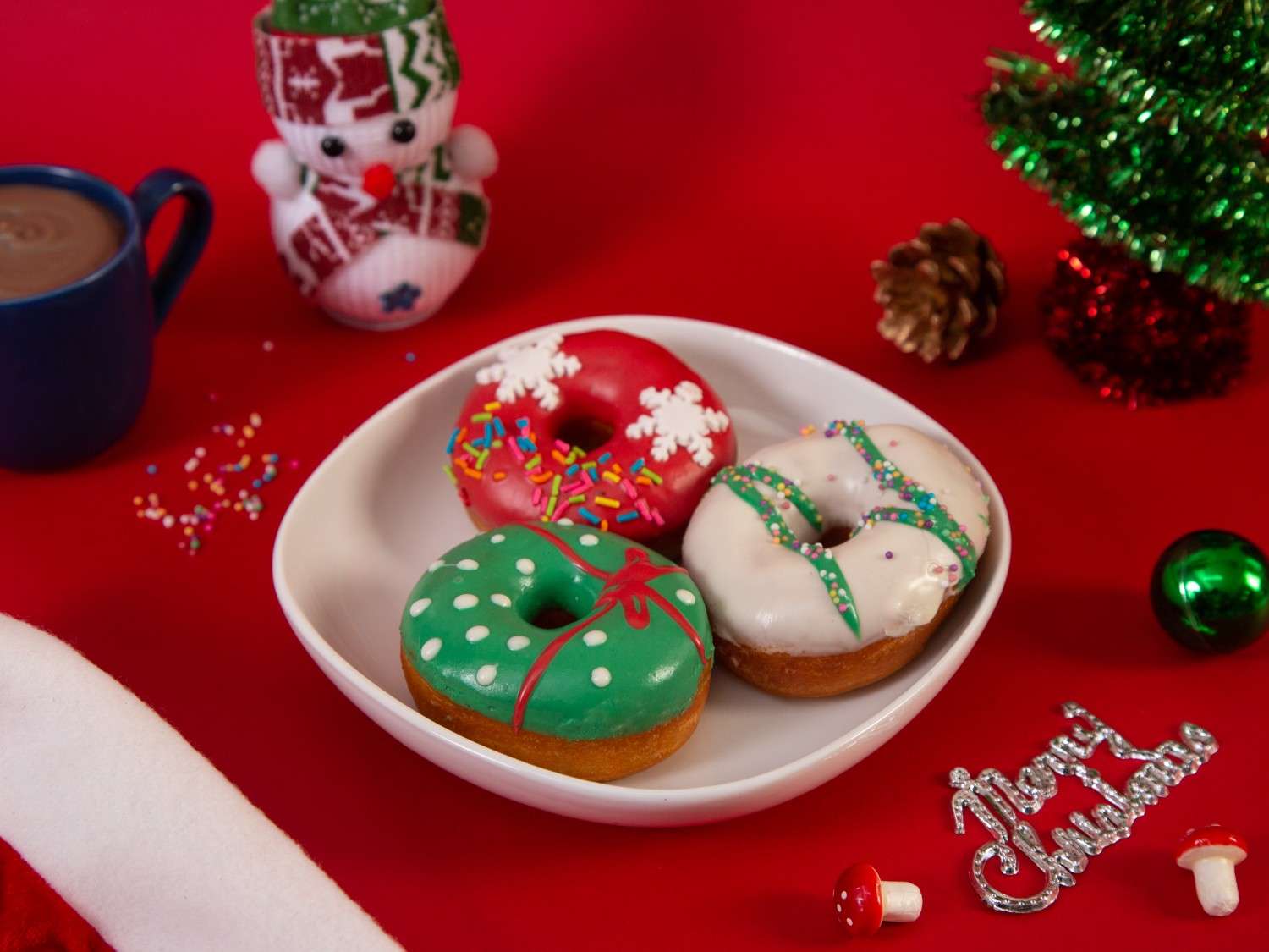 Festive X-Mas donuts glazed in vibrant red, green, and white, decorated with holiday sprinkles—perfect for adding sweetness to your celebrations.
