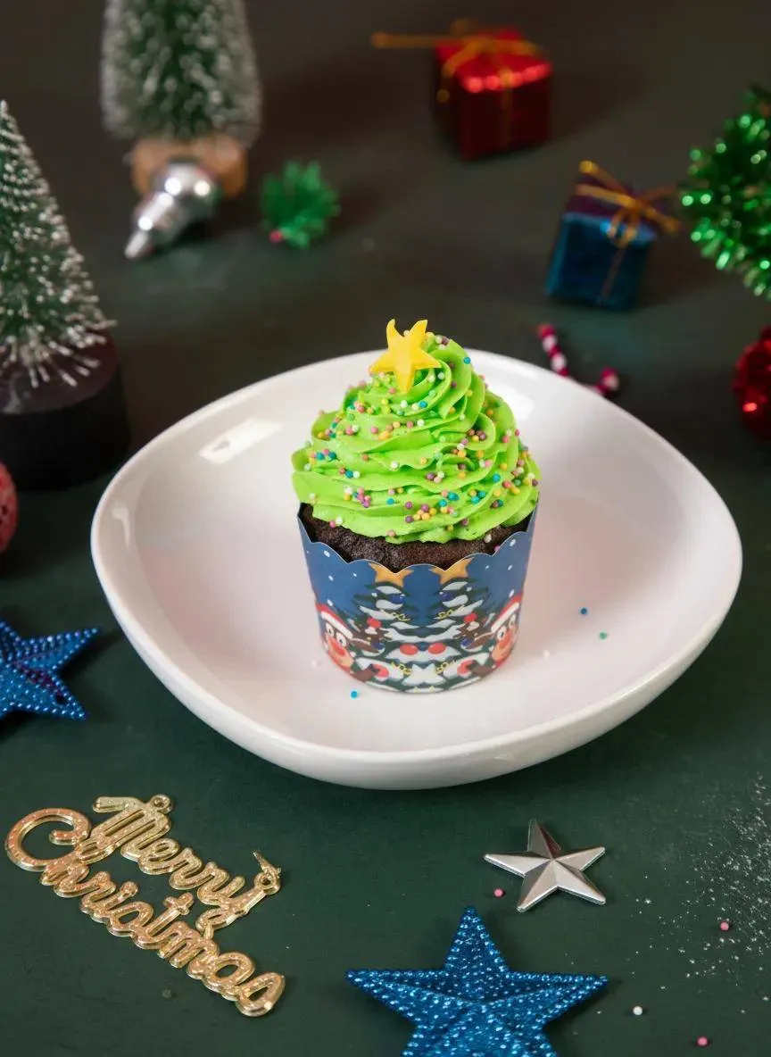 Festive X-Mas tree cupcakes, decorated with green frosting and colorful ornaments—perfect for adding a sweet touch to your holiday celebration.