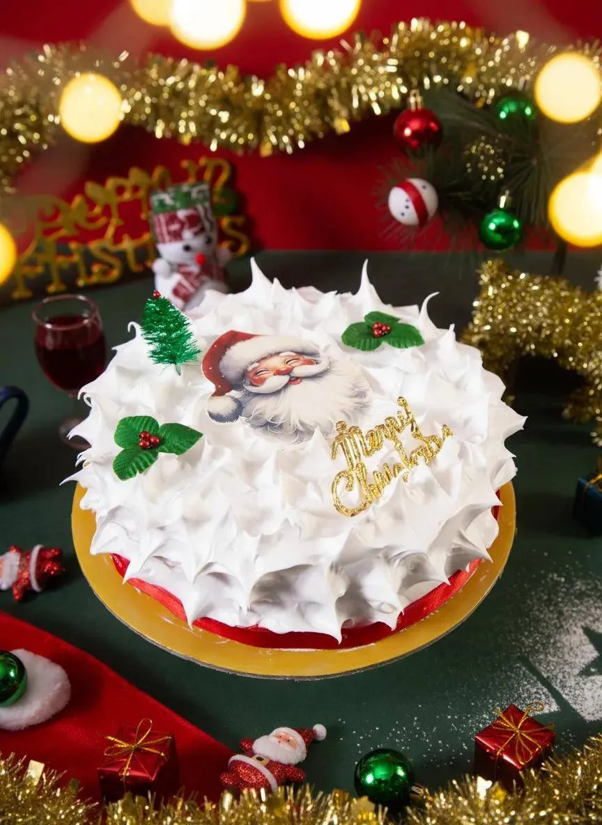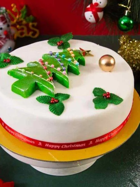 A festive Christmas cake topped with smooth icing, perfect for holiday celebrations. Rich, flavorful, and beautifully decorated for a sweet seasonal treat.