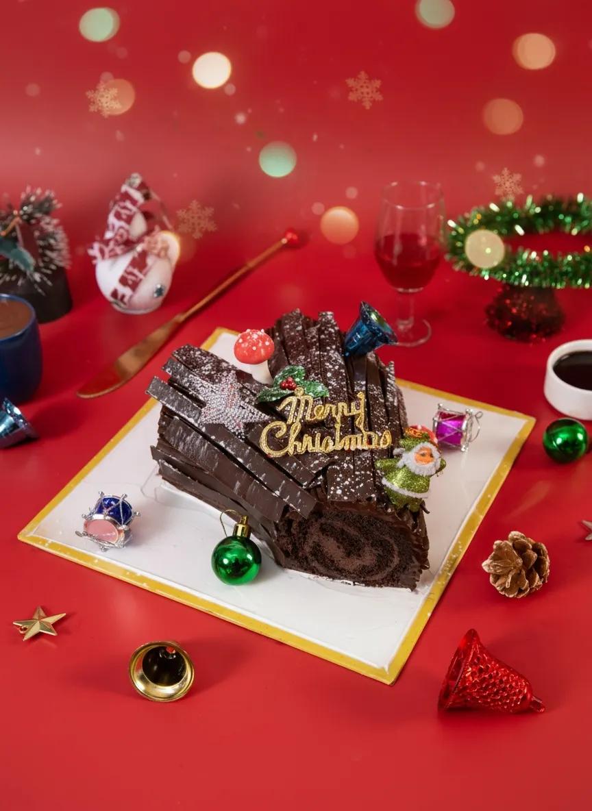 Indulge in the festive charm of our Yule Log, a rich sponge cake coated in decadent chocolate, perfect for holiday celebrations.