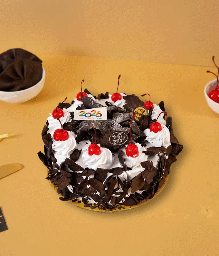 Black Forest Cake – A classic German chocolate sponge layered with whipped cream, cherries, and chocolate shavings for a rich, indulgent treat.