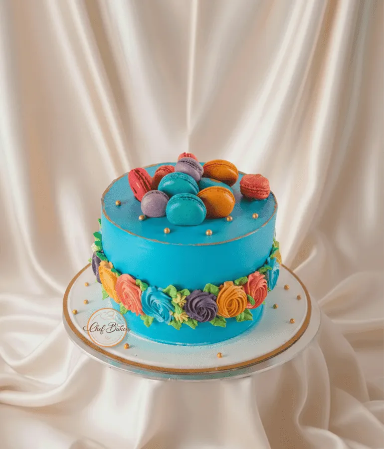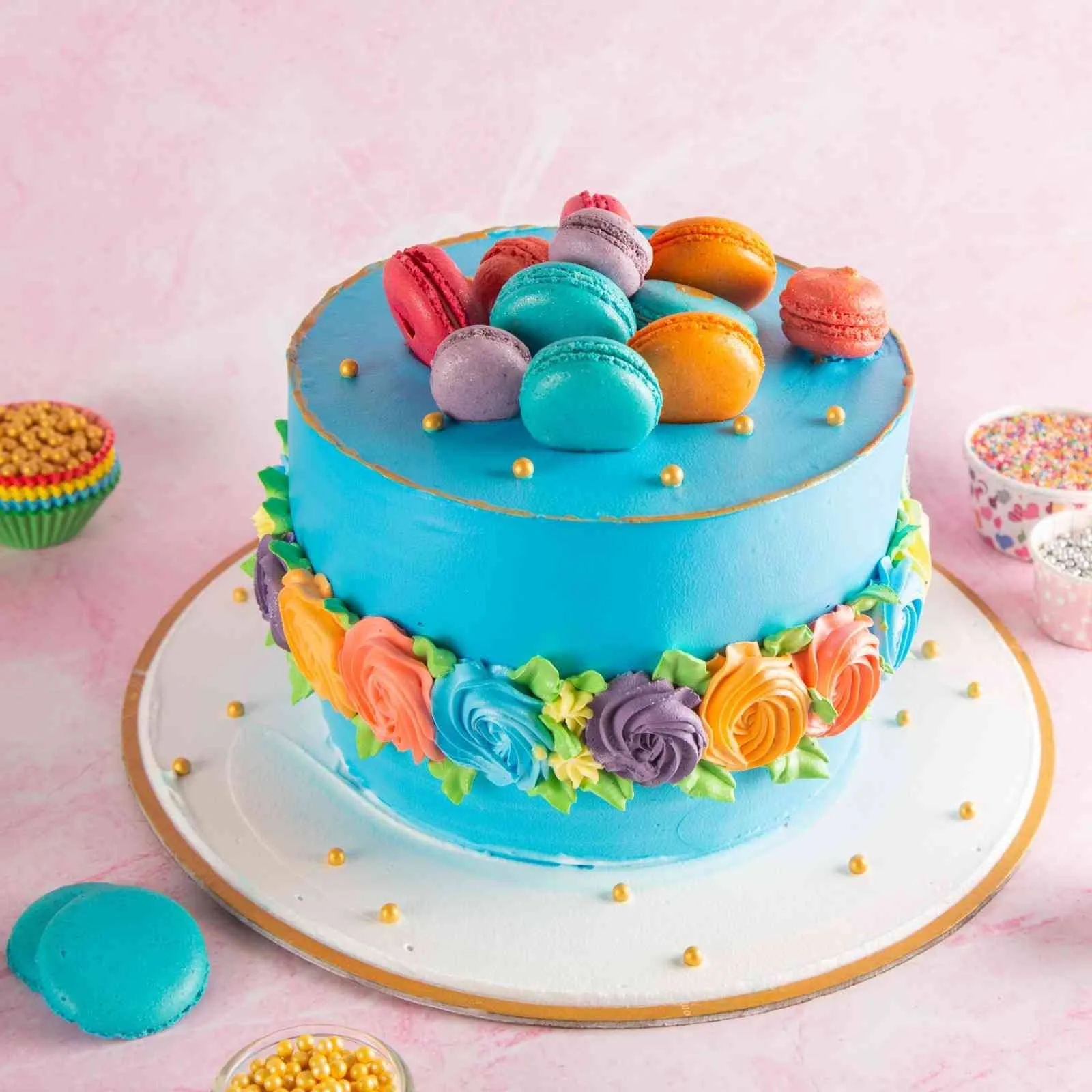 Bright floral cake crowned with vibrant macarons — a cheerful treat for birthdays, parties, or special celebrations.