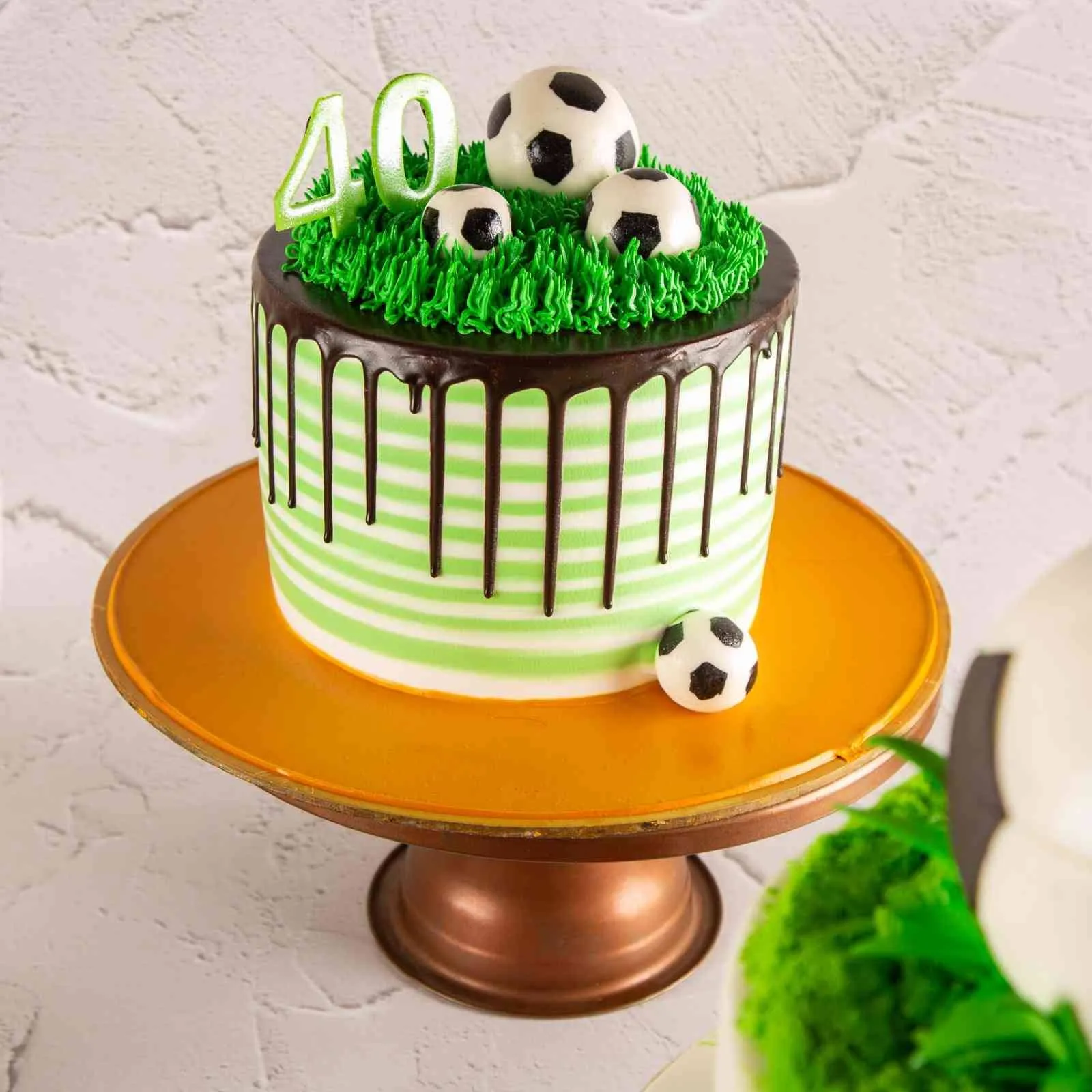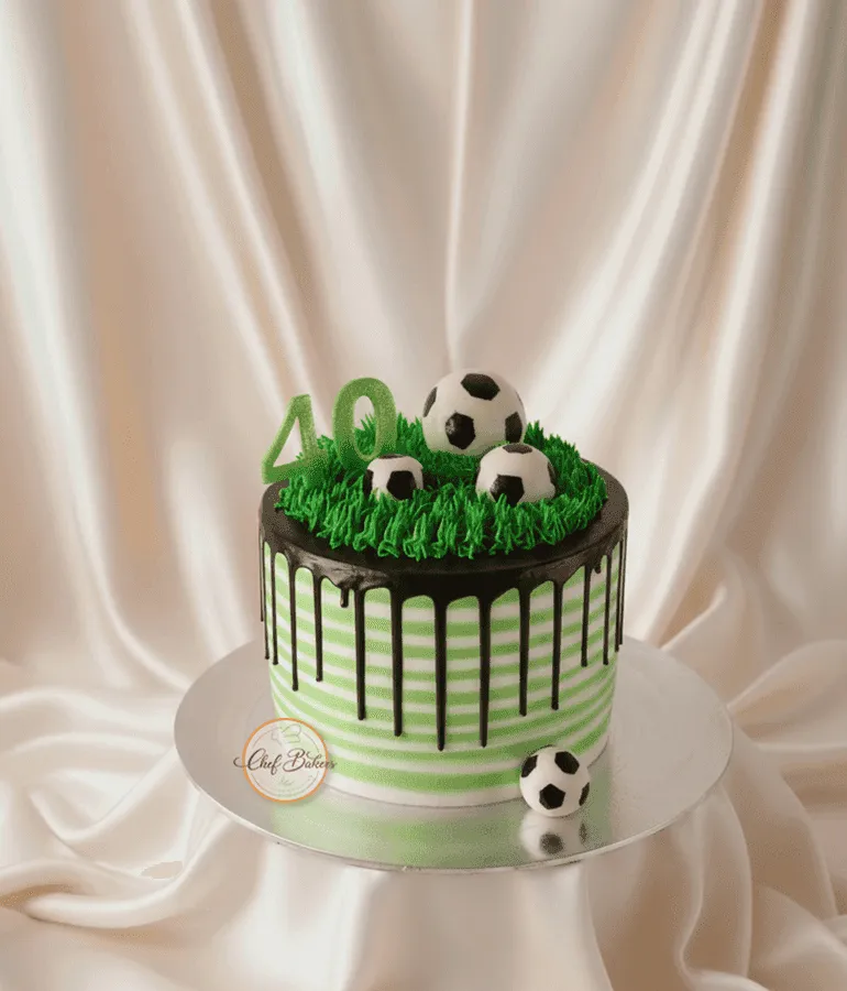 Fun football cake with grass, soccer balls, and chocolate drip — perfect for birthdays and sports lovers.