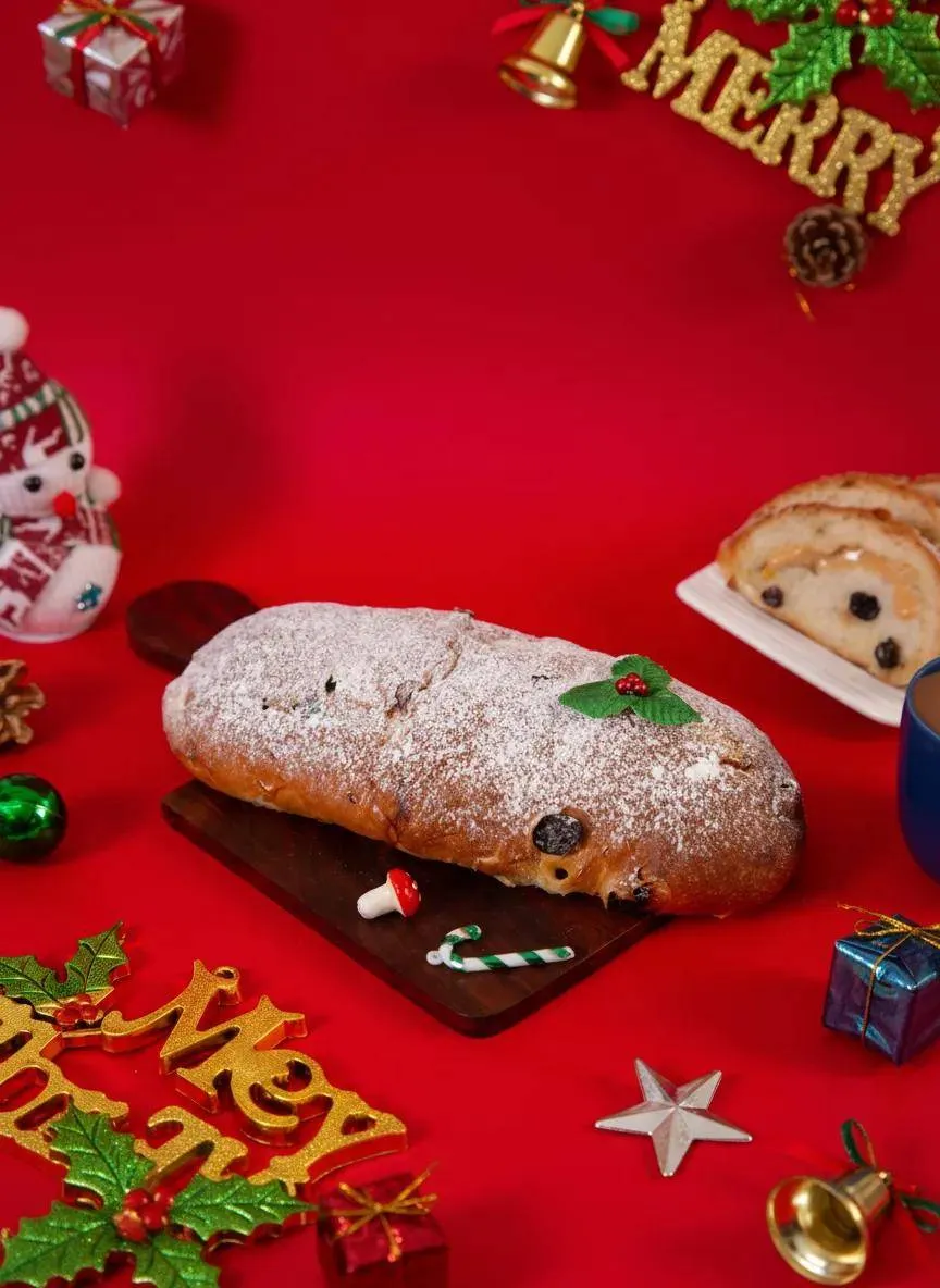 Rich buttery German Stollen filled with dried fruits, almonds & marzipan, dusted with sugar—tradition in every slice.