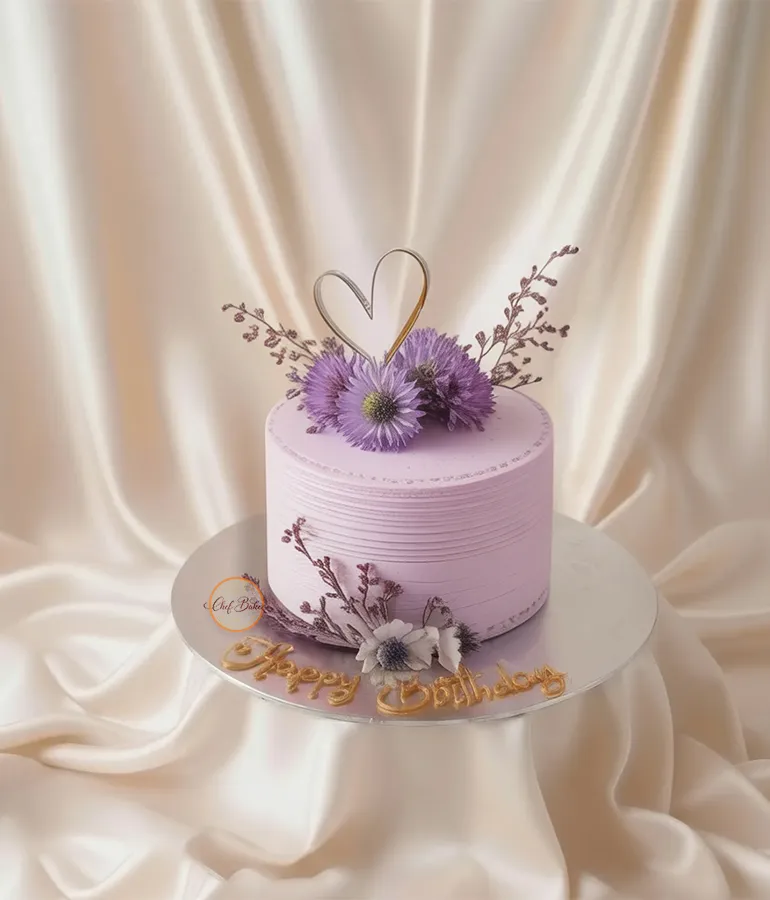 A soft purple cake adorned with delicate flowers and a heart-shaped topper, perfect for a romantic or special celebration.