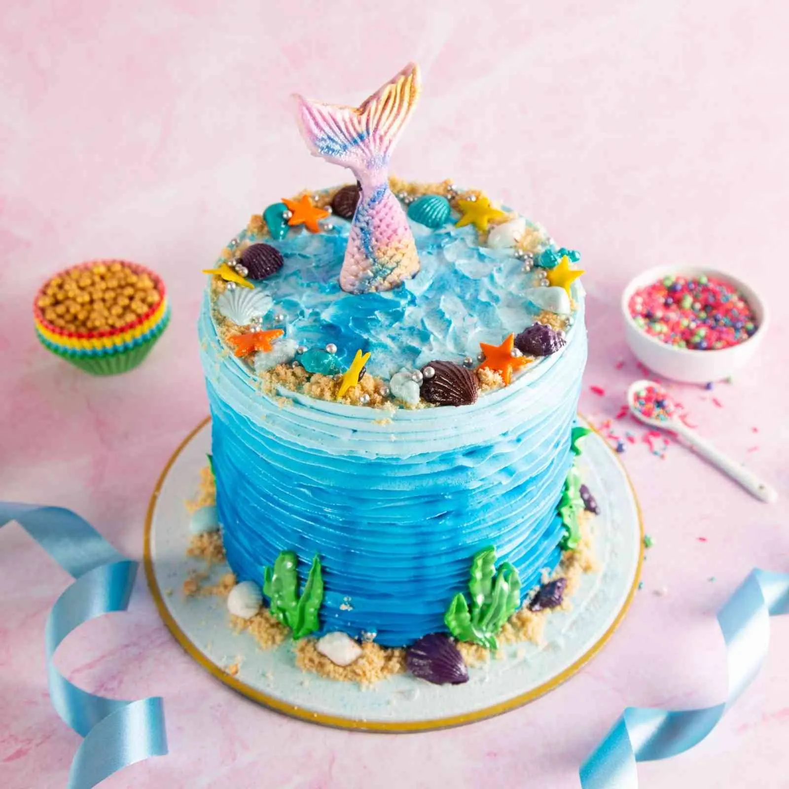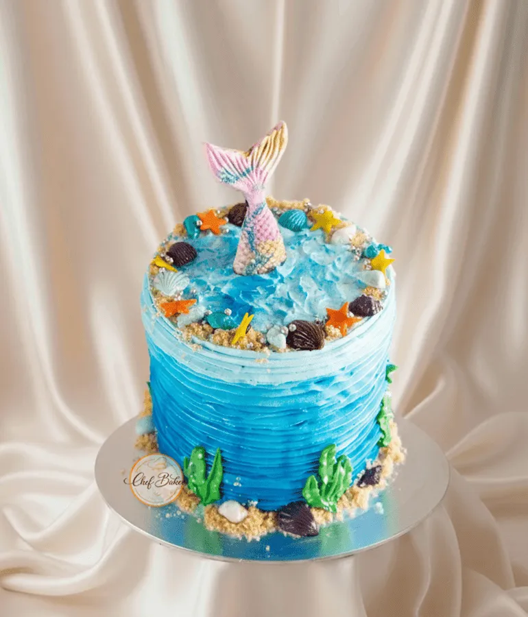 Magical underwater cake with mermaid tail and ocean décor — perfect for birthdays, sea-themed parties, and celebrations.
