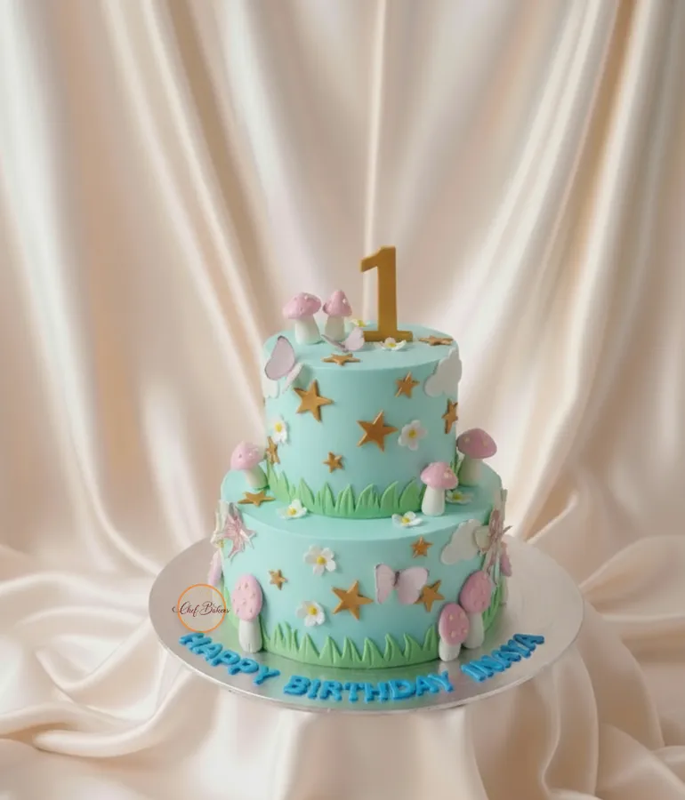 A charming two-tier cake adorned with pastel mushrooms, stars, flowers, and butterflies, perfect for any celebration or first birthday event.